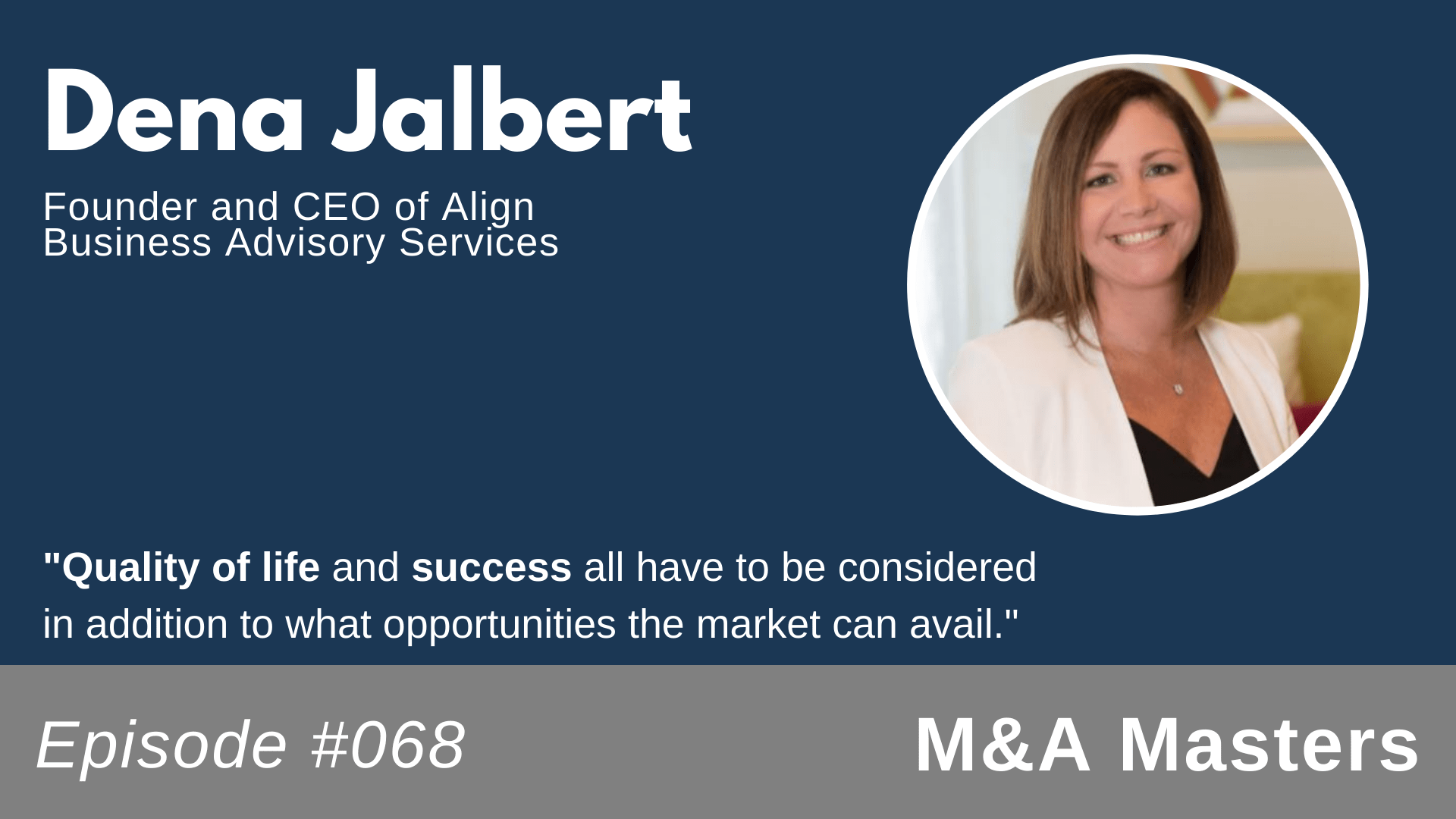 Our special guest on this week’s episode of M&A Masters is Dena Jalbert. Dena is the Founder and CEO of Align Business Advisory Services, a team of former business owners, operators, and executives in offices throughout the US who bring Wall Street resources to the lower middle market. She was