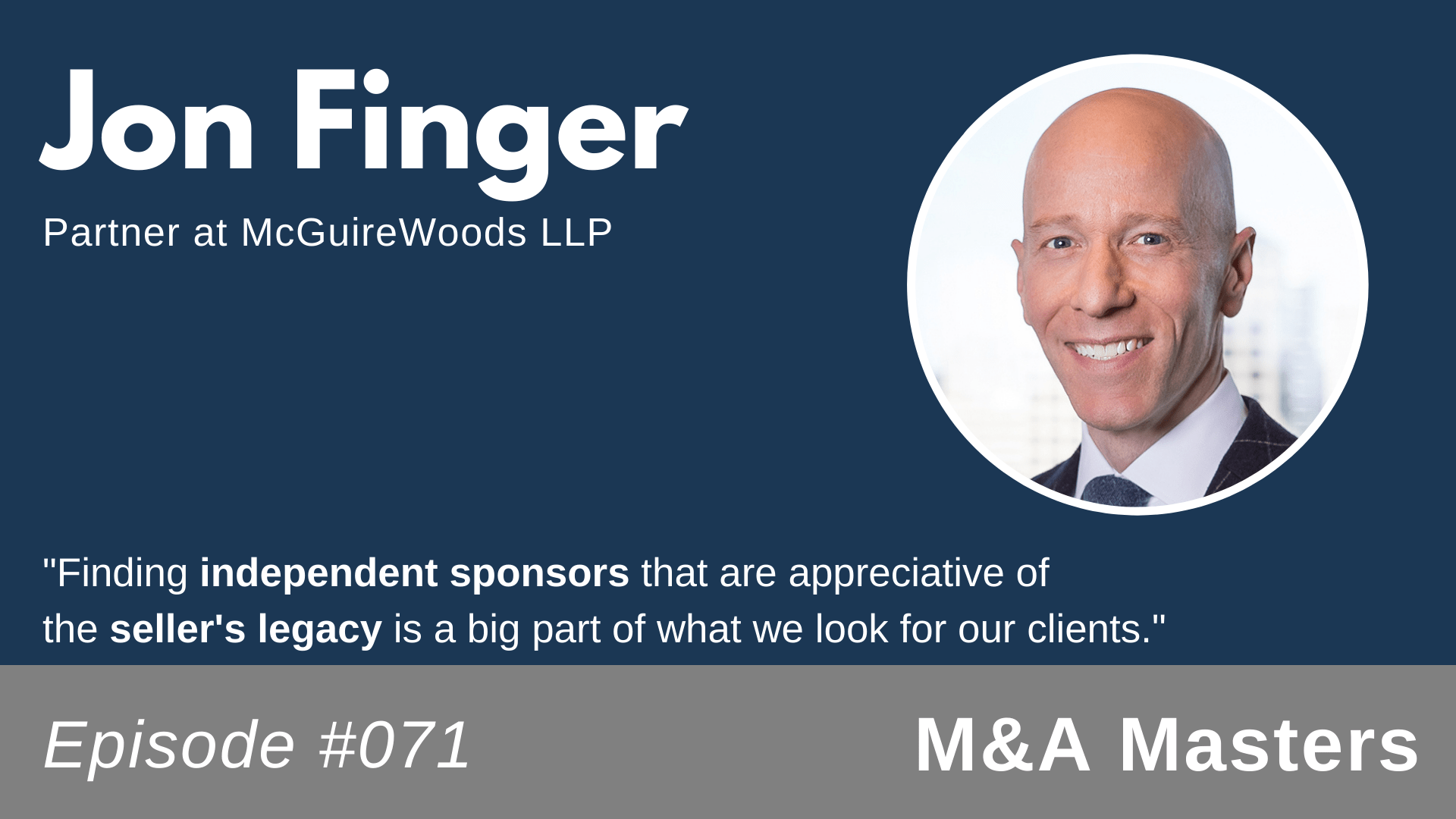 Our guest for this week’s episode of M&A Masters is Jon Finger. Jon is a Partner at McGuireWoods LLC in Dallas, and his practice focuses on private equity and corporate transactions. He and his partners were the first in the area of independent sponsors to create a private equity practice