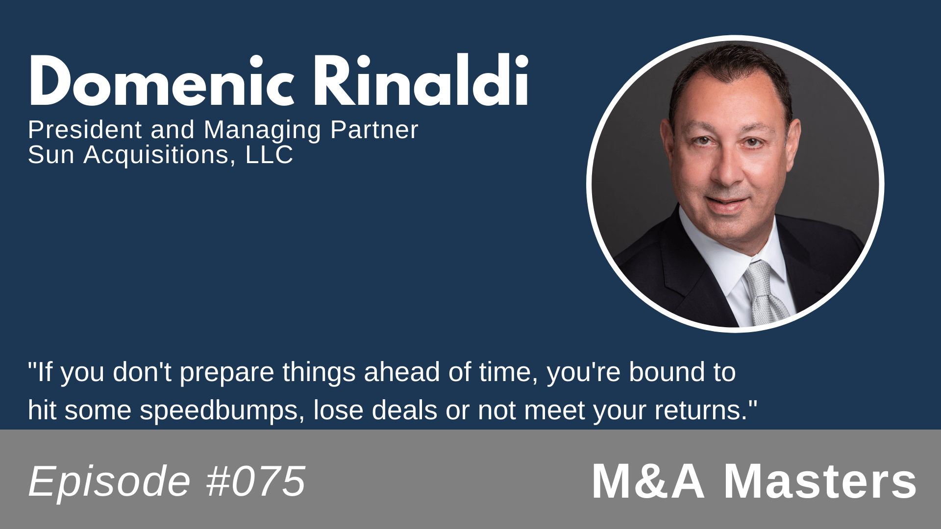 On this week’s episode of the M&A Masters podcast, we sit down with Domenic Rinaldi, President and Managing Partner of Sun Acquisitions. Sun Acquisitions is an M&A advising firm specializing in both buy-side and sell-side advisory services. Domenic also hosts his own podcast, M&A Unplugged, ranked among the top M&A